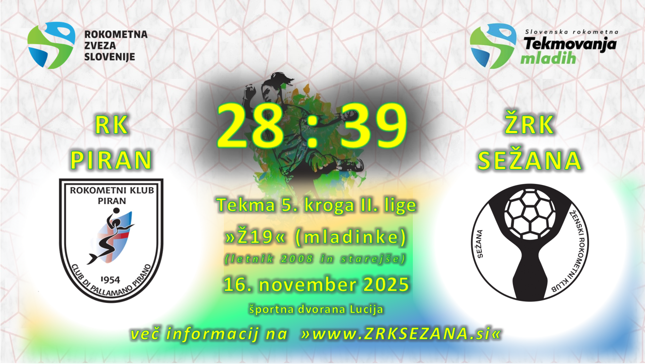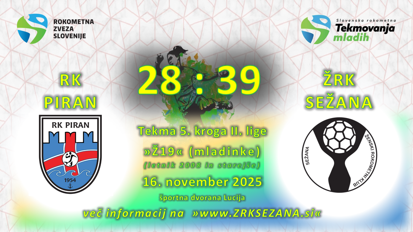 Tekma 5. kroga II. lige SRL »Ž19« ki je bila odigrana v nedeljo 16. novembra 2025, v gosteh v športni dvorani Lucija, se je od začetka odvijala po notah in željah naših maloštevilnih navijačev. Hvala Vam naši zvesti podporniki.